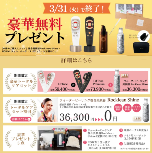 • ウォーターピーリング複合美顔器が無料でもらえる(36,300円相当)